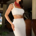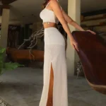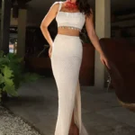 Confeccionado na malha texturizada com efeito tridimensional e fios de lurex. O cropped estruturado, enquanto a saia longa, com leve transparência nas pernas e fenda lateral ,alonga a silhueta.