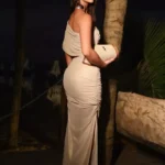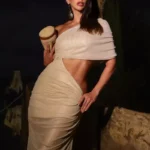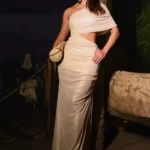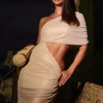 Vestido resort glamouroso confeccionado em malha de tule acetinada com efeito metálico. O modelo valoriza curvas femininas com recorte lateral estratégico e caimento drapeado, exaltando a silhueta com sofisticação. O ombro único traz assimetria fashion e elegância ao visual.